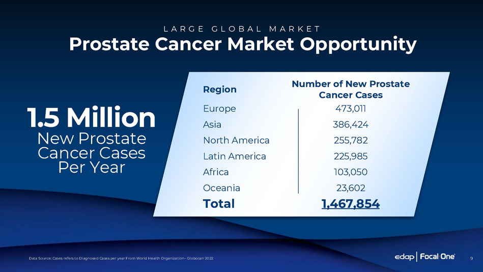 3.3 Million American Men Living with Prostate Cancer in the U.S. (1) 313,780 New Cases Diagnosed in the U.S. (1) 35,770 U.S. Deaths from Prostate Cancer (1) U . S . P R O S T A T E C A N C E R M A R K E T Prostate Cancer is the Most Common Cancer Amongst Men In the U.S. Prostate (1) 2025 estimates from the American Cancer Society ( www.cancer.org ) 8 Lung & Bronchus Colorectum Skin Urinary Bladder New Cases Deaths