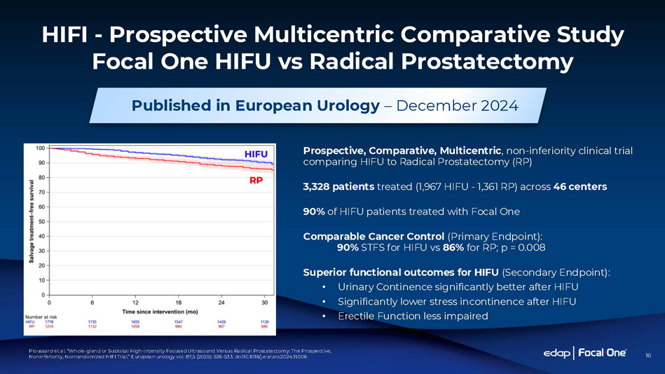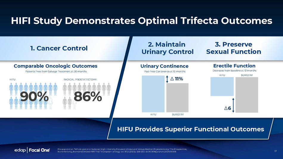 16 HIFI - Prospective Multicentric Comparative Study Focal One HIFU vs Radical Prostatectomy Prospective, Comparative, Multicentric , non - inferiority clinical trial comparing HIFU to Radical Prostatectomy (RP) 3,328 patients treated (1,967 HIFU - 1,361 RP) across 46 centers 90% of HIFU patients treated with Focal One Comparable Cancer Control (Primary Endpoint): 90% STFS for HIFU vs 86% for RP; p = 0.008 Superior functional outcomes for HIFU (Secondary Endpoint): • Urinary Continence significantly better after HIFU • Significantly lower stress incontinence after HIFU • Erectile Function less impaired Published in European Urology – December 2024 Ploussard et al. “Whole - gland or Subtotal High - intensity Focused Ultrasound Versus Radical Prostatectomy: The Prospective, Noninferiority, Nonrandomized HIFI Trial.” European urology vol. 87,5 (2025): 526 - 533. doi:10.1016/j.eururo.2 024.11.006