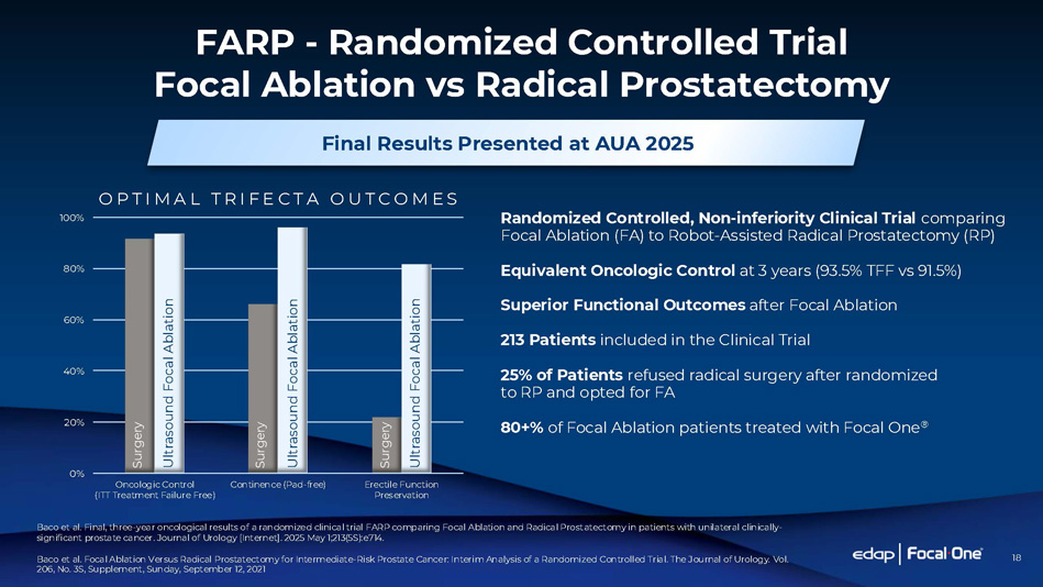18 FARP - Randomized Controlled Trial Focal Ablation vs Radical Prostatectomy Randomized Controlled, Non - inferiority Clinical Trial comparing Focal Ablation (FA) to Robot - Assisted Radical Prostatectomy (RP) Equivalent Oncologic Control at 3 years (93.5% TFF vs 91.5%) Superior Functional Outcomes after Focal Ablation 213 Patients included in the Clinical Trial 25% of Patients refused radical surgery after randomized to RP and opted for FA 80+% of Focal Ablation patients treated with Focal One ® Baco et al. Final, three - year oncological results of a randomized clinical trial FARP comparing Focal Ablation and Radical Prostatectomy in patients with unilateral clinically - significant prostate cancer. Journal of Urology [Internet]. 2025 May 1;213(5S):e714. Baco et al. Focal Ablation Versus Radical Prostatectomy for Intermediate - Risk Prostate Cancer: Interim Analysis of a Randomized Controlled Trial. The Journal of Urology. Vol. 206, No. 3S, Supplement, Sunday, September 12, 2021 Final Results Presented at AUA 2025 0% 20% 40% 60% 80% 100% Oncologic Control (ITT Treatment Failure Free) Continence (Pad - free) Erectile Function Preservation Surgery Ultrasound Focal Ablation Surgery Ultrasound Focal Ablation Surgery Ultrasound Focal Ablation O P T I M A L T R I F E C T A O U T C O M E S