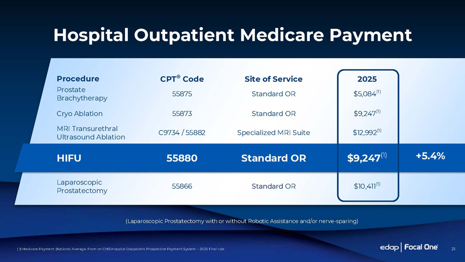 20 Environment for Growth S T R O N G R E I M B U R SE M E N T Creates Favorable 1. APC Level 6 Under CMS for CY23 and CY24 (1,3) 2. 90% Increase in Reimbursement in 2023 (1,2) 3. APC Level 6 Maintained by CMS in 2025 (3) (1) CMS Hospital Outpatient Prospective Payment System - 2023 Final rule (2) CMS Hospital Outpatient Prospective Payment System - 2022 Final rule (3) CMS Hospital Outpatient Prospective Payment System – 2025 Final rule
