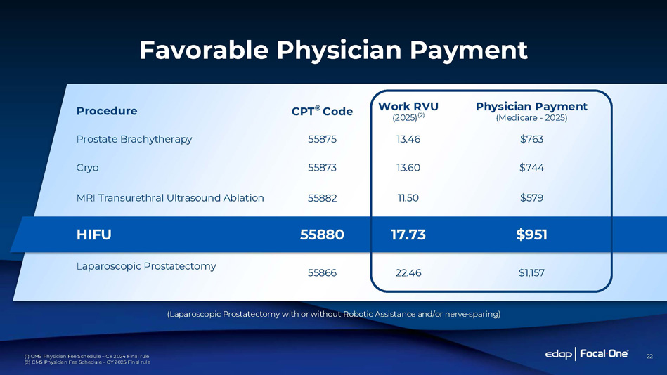 22 (Laparoscopic Prostatectomy with or without Robotic Assistance and/or nerve - sparing) (1) CMS Physician Fee Schedule – CY 2 024 Final rule (2) CMS Physician Fee Schedule – CY 2025 Final rule Physician Payment (Medicare - 2025) Work RVU (2025) (2) CPT ® Code Procedure $763 13.46 55875 Prostate Brachytherapy $744 13.60 55873 Cryo $579 11.50 55882 MRI Transurethral Ultrasound Ablation $951 17.73 55880 HIFU $1,157 22.46 55866 Laparoscopic Prostatectomy Favorable Physician Payment