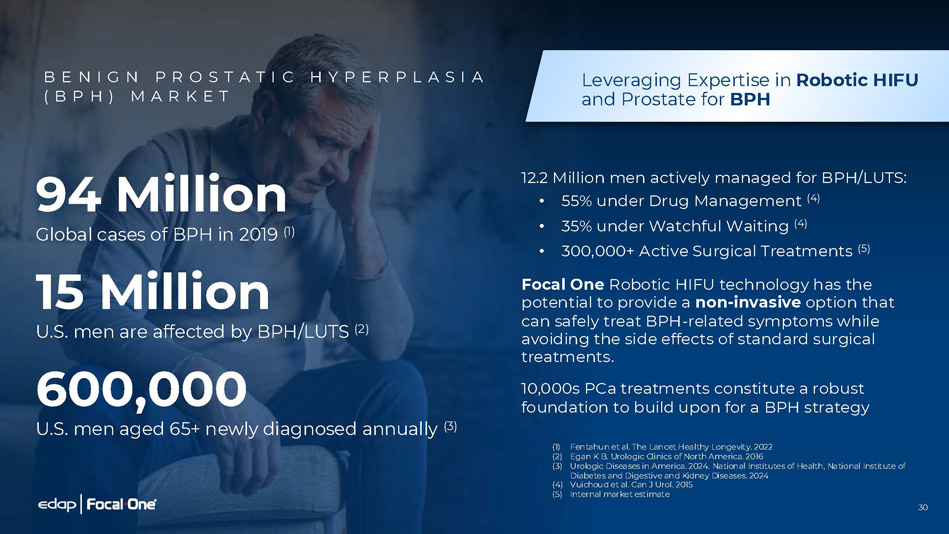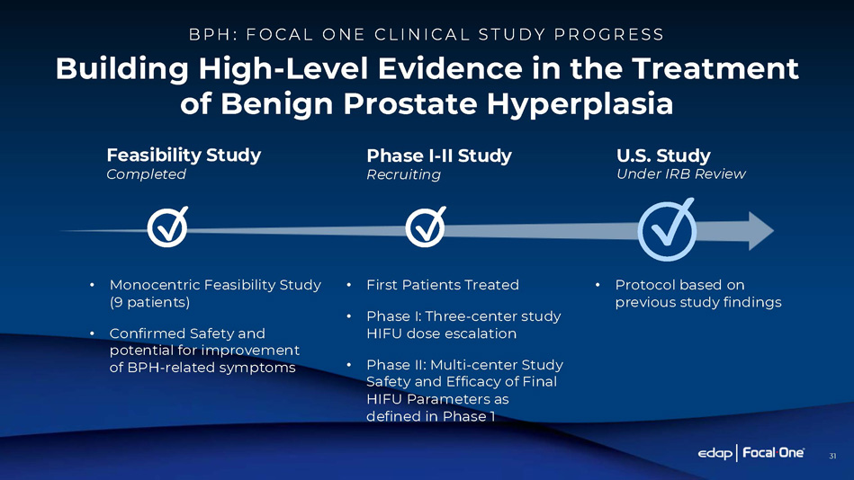 94 Million Global cases of BPH in 2019 (1) 15 Million U.S. men are affected by BPH/LUTS (2) 600,000 U.S. men aged 65+ newly diagnosed annually (3) Leveraging Expertise in Robotic HIFU and Prostate for BPH 12.2 Million men actively managed for BPH/LUTS: • 55% under Drug Management (4) • 35% under Watchful Waiting (4) • 300,000+ Active Surgical Treatments (5) Focal One Robotic HIFU technology has the potential to provide a non - invasive option that can safely treat BPH - related symptoms while avoiding the side effects of standard surgical treatments. 10,000s PCa treatments constitute a robust foundation to build upon for a BPH strategy (1) Fentahun et al. The Lancet Healthy Longevity. 2022 (2) Egan K B. Urologic Clinics of North America. 2016 (3) Urologic Diseases in America. 2024. National Institutes of Health, National Institute of Diabetes and Digestive and Kidney Diseases. 2024 (4) Vuichoud et al. Can J Urol. 2015 (5) Internal market estimate B E N I G N P R O S T A T I C H Y P E R P L A S I A ( B P H ) M A R K E T 30