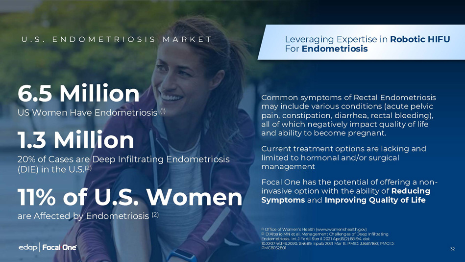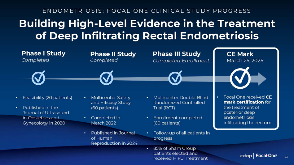 32 6.5 Million US Women Have Endometriosis (1) 1.3 Million 20% of Cases are Deep Infiltrating Endometriosis (DIE) in the U.S. (2) 11% of U.S. Women are Affected by Endometriosis (2) Leveraging Expertise in Robotic HIFU For Endometriosis Common symptoms of Rectal Endometriosis may include various conditions (acute pelvic pain, constipation, diarrhea, rectal bleeding), all of which negatively impact quality of life and ability to become pregnant. Current treatment options are lacking and limited to hormonal and/or surgical management Focal One has the potential of offering a non - invasive option with the ability of Reducing Symptoms and Improving Quality of Life (1) Office of Women’s Health ( www.womenshealth.gov) (2) D'Alterio MN et al. Management Challenges of Deep Infiltrating Endometriosis. Int J Fertil Steril. 2021 Apr;15(2):88 - 94. doi: 10.22074/IJFS.2020.134689. Epub 2021 Mar 11. PMID: 33687160; PMCID: PMC8052801 U . S . E N D O M E T R I O S I S M A R K E T