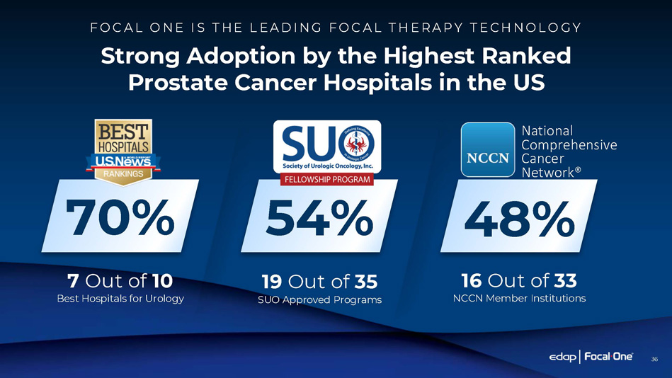 Strong Adoption by the Highest Ranked Prostate Cancer Hospitals in the US F O C A L O N E I S T HE L E A D I N G F O C A L T H E R A P Y T E C H N O L O G Y 70% 7 Out of 10 Best Hospitals for Urology National Comprehensive Cancer Network® 48% 16 Out of 33 NCCN Member Institutions 54% 19 Out of 35 SUO Approved Programs 36