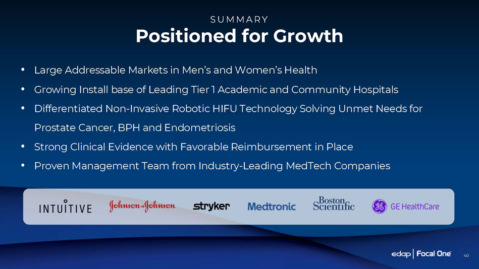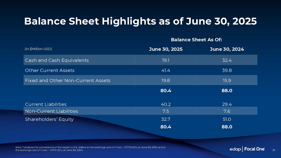 T HR E E M O N T HS E N D E D J U N E 3 0 T H 2025 2024 (in $Million USD except per share data) 18.4 17.0 Revenue 7.8 6.4 Gross Profit 42.5% 37.5% Gross Margin (6.6) (6.6) Operating Profit (Loss) (6.4) (6.6) Net Income (Loss) (0.17) (0.18) Earnings (Loss) Per Share HIFU $5.2M ESWL $2.5M Distribution $9.4M HIFU $9.7M +89% ESWL $1.8M - 27% 3 months 2024 3 months 2025 $ 1 7 . 0 M Distribution $6.9M - 26% NOTE: Translated for convenience of the reader to U.S. dollars at the 2025 average three months’ exchange rate of 1 Euro = 1.1489 USD, and 2024 average three months’ exchange rate of 1 Euro = 1.0747 USD 38 $ 1 8 . 4 M Financial Highlights as of June 30, 2025 +29% HIFU Revenue CAGR +50% Focal One US Install Base CAGR +52% US Focal One Procedure CAGR 1 st Half 2022 - 2025 HIFU Business Key Metrics